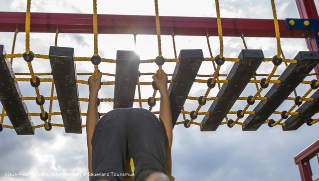 Der Spielplatz in der Dorfmitte Fleckenbergs im Umfeld von Schützenhalle, Grundschule, Kindergarten uns Sportplatz mit Kettergerüst, Sandkasten, Schaukeln und Rutsche.
