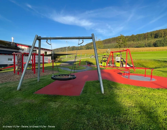 Der Spielplatz ist teilweise inklusionsgerecht gestaltet und verfügt über eine Seilbahn, ein Drehkarussell, Kletter-Zelt, Doppelturm mit Brücke und Rutsche, Wasserspiel, Hüpfsteine, Schaukel, Nestschaukel, Kletterturm, Reck, Wippe, Federwipp-Pferd, Sandkasten mit Sonnensegel und mehrere Sitzgelegenheiten.